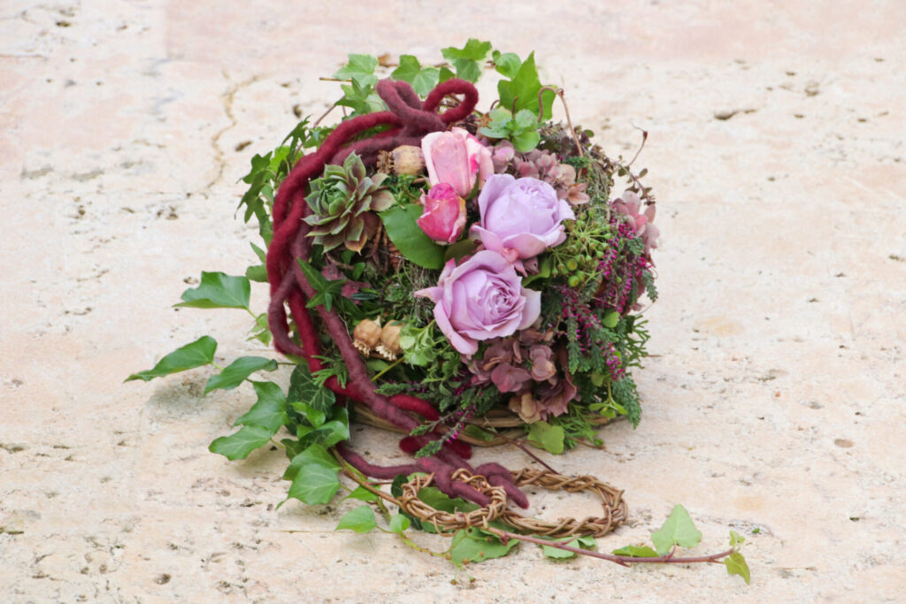 Kugel aus Styropor oder Nass-Steckschaum ø ca. 15 cm, grüne Zweige, wie Buchs, Thuja oder Efeu; Hauswurz, Zapfen, Mohnkapseln, Wilder Wein, Korkenzieherhasel; bunte Pflanzen, wie getrocknete Hortensien, Erika, frische Rosen; Dochtwolle, grüner Wickeldraht, Steckdraht oder Drahthaften, Gartenschere, Messer.