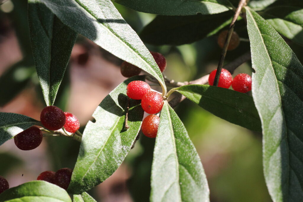 Die Doldige Ölweide (Elaeagnus umbellata) wird auch Schirm-Ölweide oder Korallen-Ölweide genannt. Findige Pflanzenzüchter, die eine Reihe interessanter Sorten ausgelesen haben, tauften sie wegen der kleinen Punkte auf den Früchten auch Pünktchenbeere oder Pointilla. Sie ist als Wildobst auch für Hausgärten interessant. Mittlerweile haben aber auch unsere Vögel die kleinen süß-sauren Köstlichkeiten als willkommenen Snack entdeckt.