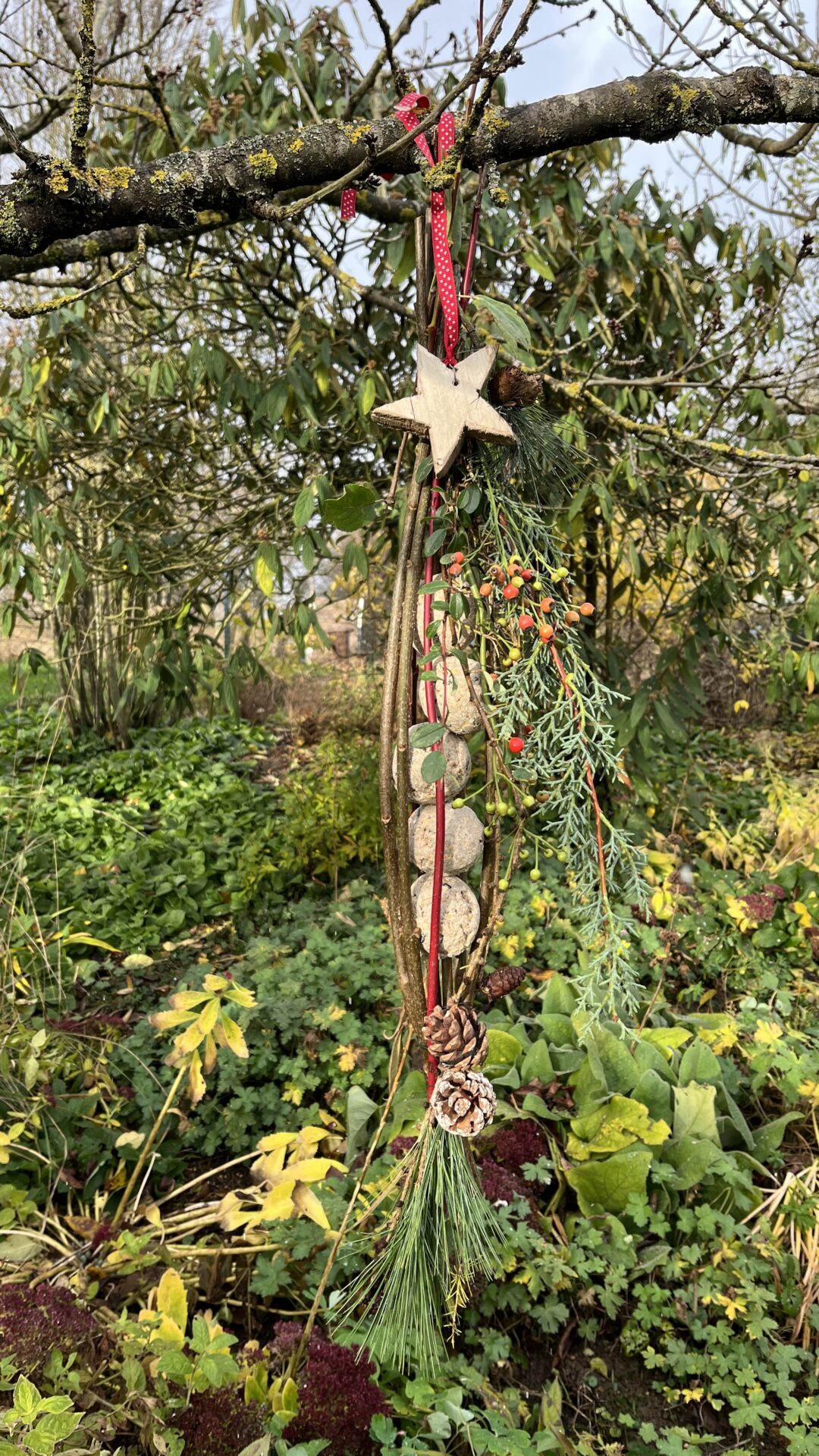 2. Immergrüne Zweige und Beerenstände mit Bindedraht zu einem Sträußchen zusammenbinden und mit einem Schmuckband am oberen Ende des Meisenknödelgerüsts befestigen. Wer mag, kann zusätzlich Tannenzapfen und Holzsterne für die Weihnachtszeit anbringen.