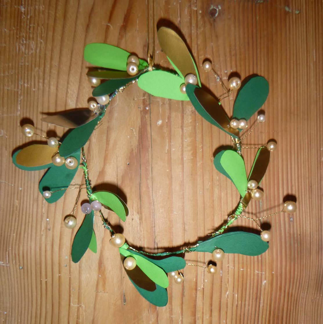 - Eine Perle auf Golddraht fädeln und festdrehen. Dann zwei Mistelblätter auffädeln und die langen Enden mit dem Draht zusammenzwirbeln.