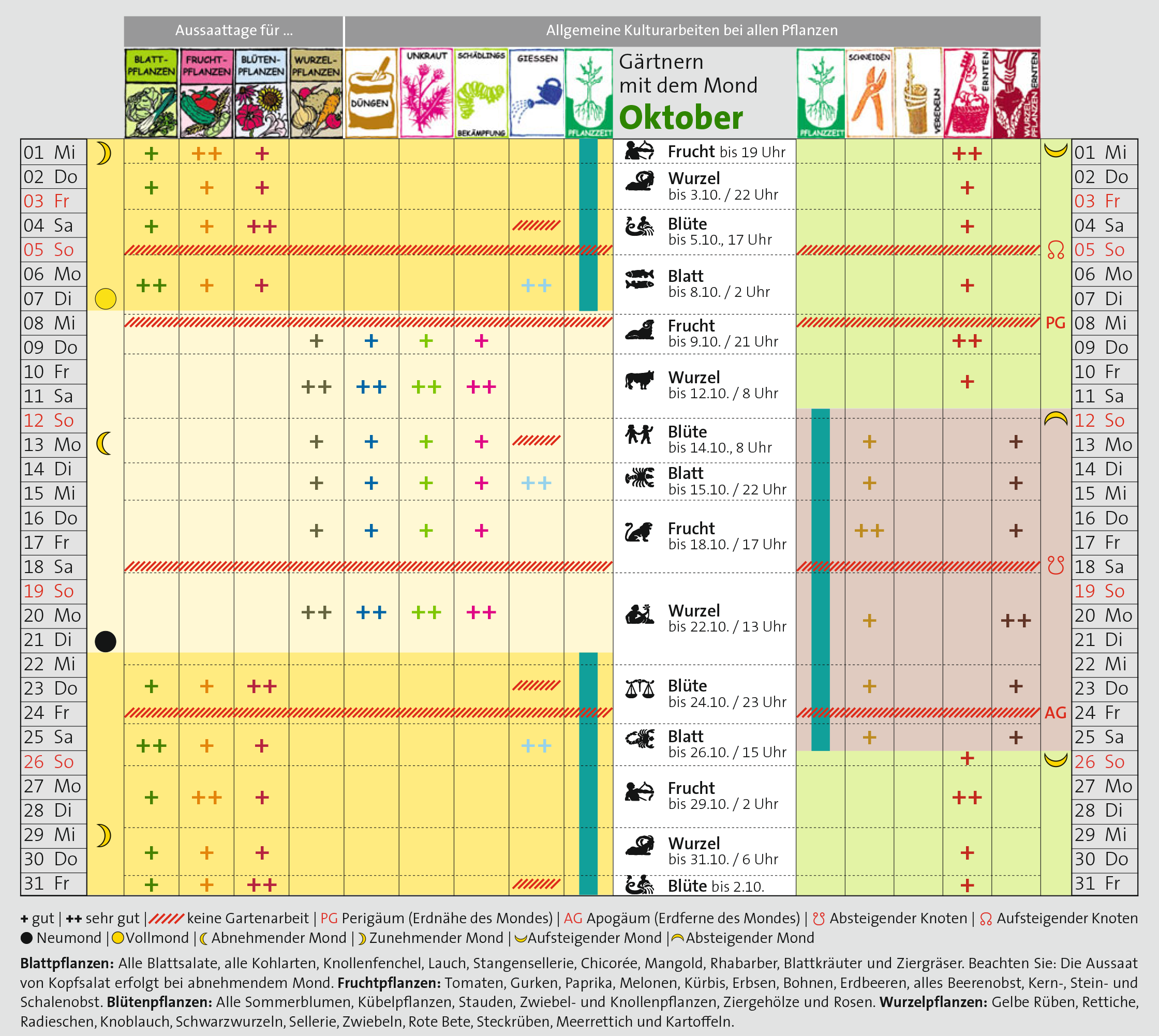Sehr geeignet für Fruchtpflanzen am 1.10. und 26.10. (ab 15 Uhr) bis 28.10., für Blütenpflanzen am 4.10., 22.10. (ab 13 Uhr) bis 23.10. und am 31.10. sowie für Blattpflanzen (z. B. Spinat, Feldsalat) am 6./7.10. und 25./26.10. (bis 15 Uhr).
