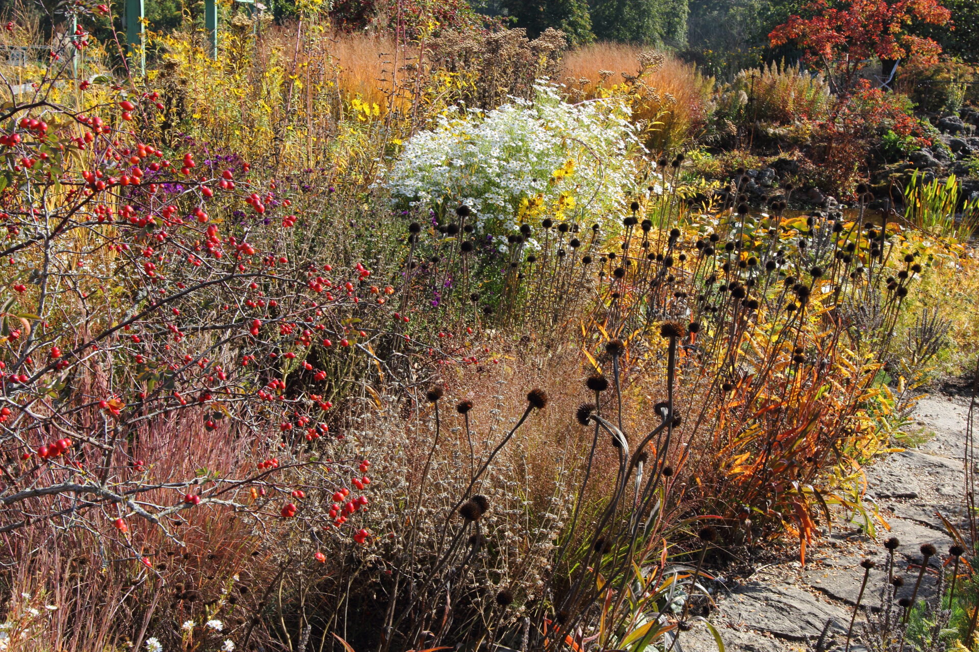 Nicht nur Gräser zaubern wunderschöne Winteraspekte auf das Staudenbeet. Auch eine ganze Reihe von Stauden sorgt mit reizvollen Blütenständen, gefärbten Stängeln, immergrünem Laub oder späten Blüten für Abwechslung und Dynamik in der ruhigen Jahreszeit. Man sollte also sorgfältig überlegen, bevor man zur Schere greift und mal das eine oder andere bis in den Spätwinter oder noch besser bis zum Frühjahr stehen lassen. Nicht nur das Auge erfreut sich daran. Auch überwinternde Insekten, hungrige Vögel und schutzbedürftige Igel auf der Suche nach einem Winterquartier danken es. Ein radikaler Rückschnitt, wie man ihn von früher kennt, hat im Grunde ausgedient, denn er hat mit winterfestmachen nichts zu tun. Ganz im Gegenteil – weniger und später schneiden bedeutet mehr Wintergenuss!