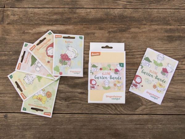 Gärtnern macht Spaß! Probier’s aus – die Kleine Garten-Bande hilft dir dabei: Rudi, das schnell reifende Radieschen, Rotkäppchen, die kleine köstliche Tomate, Piro, der knackig-frische Pflücksalat, die Kapuzinerkresse mit ihren hübschen Blüten und die wundervoll süß schmeckende Erbse Wunder von Kelvedon. Ganz egal, ob du ihnen einen Platz im Garten oder auf dem Balkon anbieten kannst – Hauptsache, du kümmerst dich gut um sie. Viele Tipps, was du dabei beachten solltest, findest du in der kleinen Anleitung in der Box. Bingenheimer Saatgut.